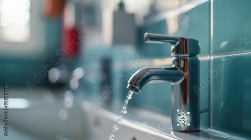 Close-up of a modern bathroom faucet with water running, highlighting the sleek design and clean tiles in a residential home.