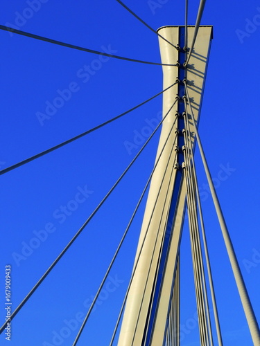 Close-up of a modern cable-stayed bridge tower with cables against a deep blue sky.