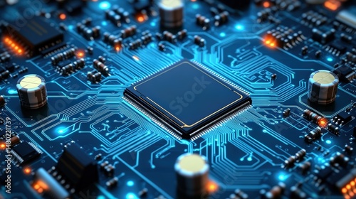 Close-up of a modern computer motherboard with integrated circuit chip and electronic components