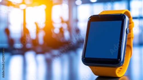Close-up of a modern smartwatch with a blank screen on a gym background during sunset hours