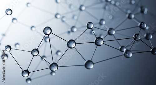 Closeup of a molecular structure with clear, spherical nodes connected by thin lines against a soft, gradient background