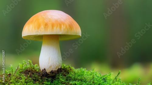 close-up of a mushroom growing in a damp forest, surrounded by moss and warm lighting, with a balanced symmetry composition