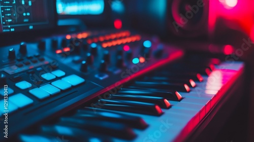 Close-up of a music keyboard and sound mixer with colorful lights in a studio