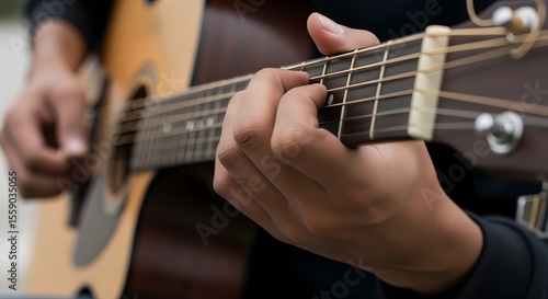 Close-up of a Musician Playing an Acoustic Guitar in Low Light, Hand Pressing Down Strings of an Acoustic Guitar Ready to Play Music