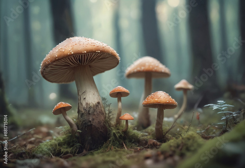 Close-up of a mystical mushrooms emerge in magical forest, blurred background