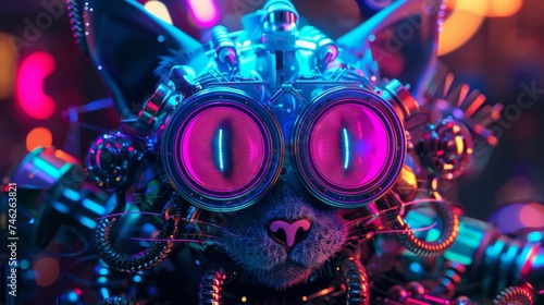 Close-up of a neon punk cat engineering in 3D, surrounded by darkness and vibrant hues
