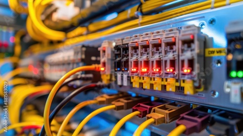 Close-up of a network server with colorful cables connected, showcasing data transfer equipment in a modern data center.