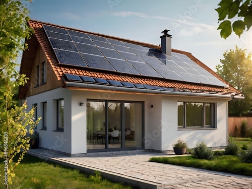 Close-up of a new suburban house with a photovoltaic system on the roof. Simple and modern environmentally friendly house with solar panels on the gable roof, with sunlight during the day