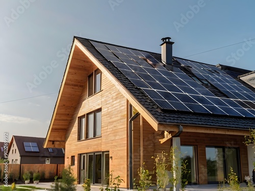 Close-up of a new suburban house with a photovoltaic system on the roof. Simple and modern environmentally friendly house with solar panels on the gable roof, with sunlight during the day