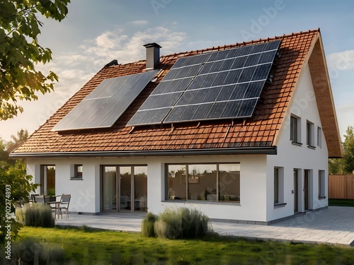 Close-up of a new suburban house with a photovoltaic system on the roof. Simple and modern environmentally friendly house with solar panels on the gable roof, with sunlight during the day
