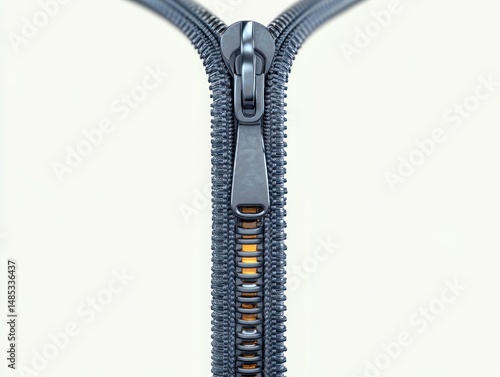 Close-up of a partially unzipped metallic zipper with shiny silver teeth on a light background, showing detailed texture and reflection