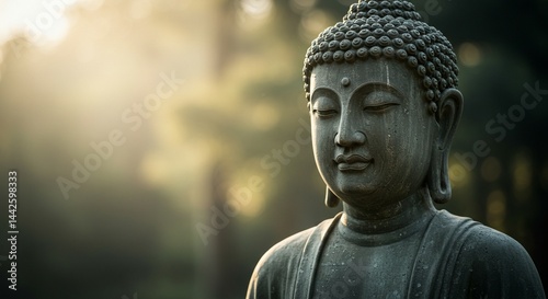 Close-up of a peaceful Buddha statue in a meditative pose, showing intricate details of the face and robes. Soft morning light enhances the textures, with a blurred forest background.