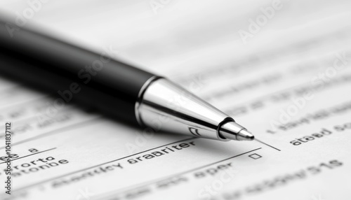 Close-up of a pen resting on a blank document with checkboxes during paperwork review