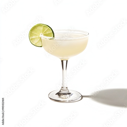 Closeup of a perfectly crafted margarita cocktail featuring a glass filled with a golden hued liquid adorned with a salted rim and a fresh lime wedge