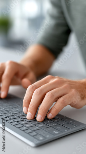 Close-up of a person typing on a slim, modern keyboard in a bright, professional setting.