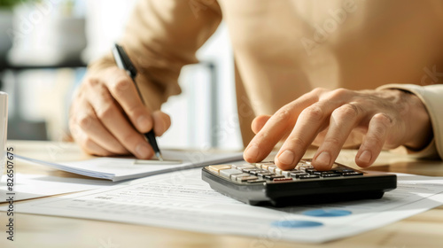 Close-up of a person using a calculator and writing on documents, focusing on calculating finances or expenses, with natural light on the table.