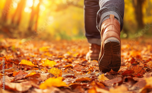 Close-up of a person walking on fallen autumn leaves in a forest during a sunny day.