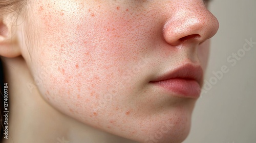 Close-up of a person's face with visible skin texture, showcasing natural imperfections and healthy glow, representing authenticity and self-confidence in beauty.