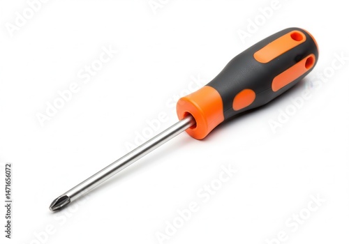 Close-up of a phillips head screwdriver with an orange and black handle on a white background