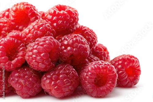Closeup of a Pile of Ripe Red Raspberries on White Background
