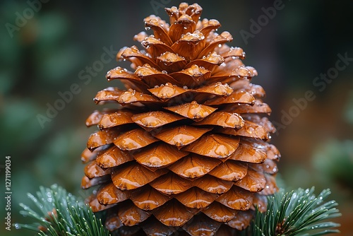 Close-up of a pine cone with water droplets, surrounded by green pine needles in a forest setting