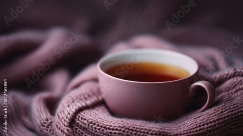 Close-up of a pink cup of tea on a knitted blanket. the cup is filled with a dark brown liquid, possibly tea, and there is steam rising from it.