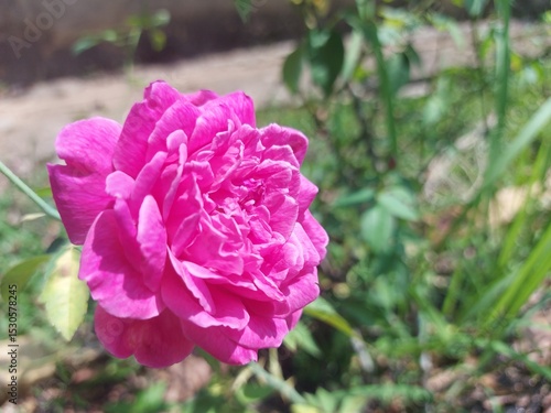Close-up of a pink rose in full bloom with layered petals, displaying romantic softness and daylight texture.