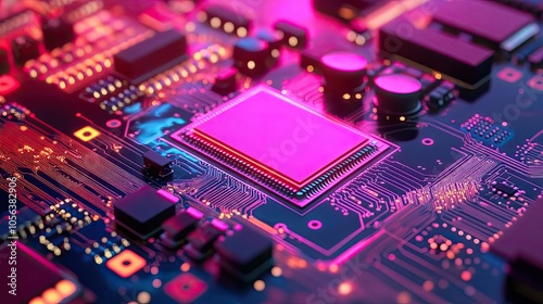 Close-up of a Pink-Lit Computer Chip on a Circuit Board