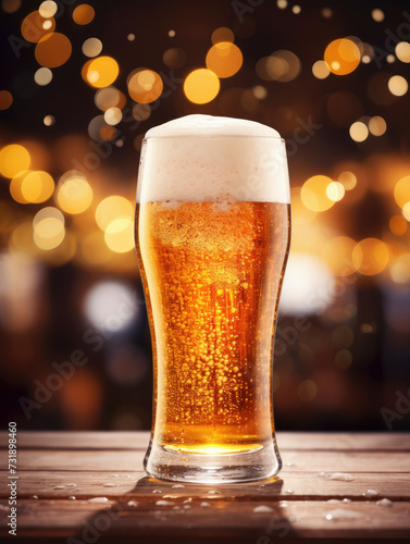 close-up of a pint of beer with bubbles rising to the surface and blurred pub background