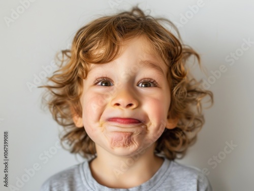 Close-up of a playful child making a funny face, with a simple white backdrop, showcasing humor and joy