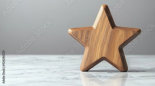 Close-up of a polished wooden star, isolated on a pristine white surface, symbolizing recognition and excellence, minimalist award concept