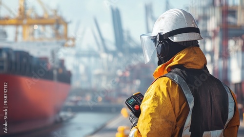 Close-up of a port worker wearing safety gear, communicating via radio amidst a backdrop of ships and containers.