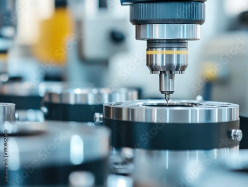 Close-up of a Precision Measurement Tool Inspecting a Metal Part During Manufacturing Process