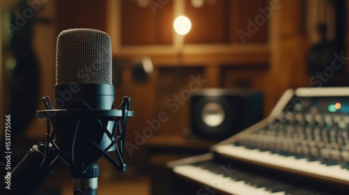 Closeup of a professional podcast microphone resting on a desk in a recording ready podcast home studio. Selective focus of podcast equipment in empty room