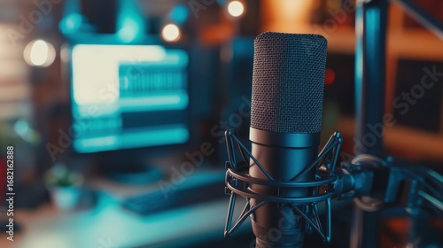 Closeup of a professional podcast microphone resting on a desk in a recording ready podcasting home studio. Selective focus of podcast equipment in empty room, ready to be used for online streaming