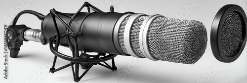 Close-up of a professional studio microphone on white background. Ideal for podcasts, voiceovers, music production, and broadcast visuals.