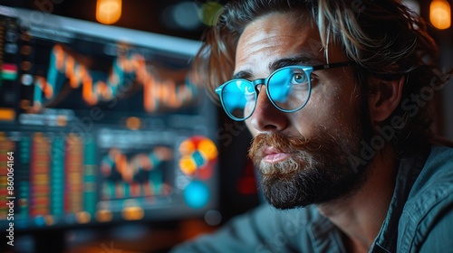 Close-up of a professional working in an office, reviewing detailed trading insights on a sleek computer screen, vibrant charts and graphs, realistic financial data, modern design, high-resolution dis