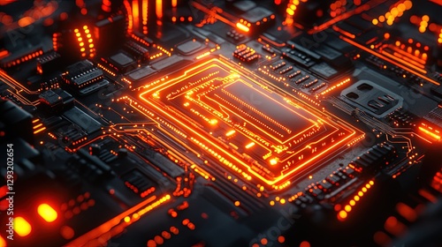 Close-up of a quantum computer chip with neon circuits and particles swirling around, futuristic tech
