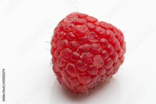 Closeup of a raspberry in a spoon on a white background