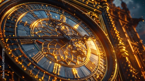 Close-up of a realistic Big Ben clock face, capturing the intricate details of the clock hands, Roman numerals, and the golden glow of the sun.
