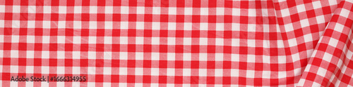 Closeup of a red and white checkered napkin or tablecloth texture. picnic cloth crumpled. Food decor element. Kitchen accessories. Top view background.
