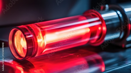 Close-up of a red lightsaber emitting vibrant light, with a detailed silver handle resting on a dark surface
