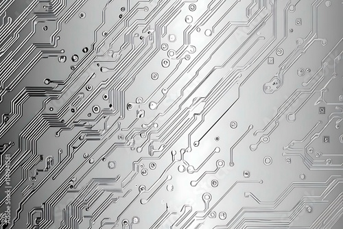Close-up of a reflective metallic circuit board showcasing intricate patterns and electronic connections, symbolizing technology, innovation, and futuristic design.