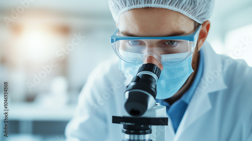 Close-up of a researcher analyzing samples under a microscope in a laboratory, wearing safety gear and focused on his work.