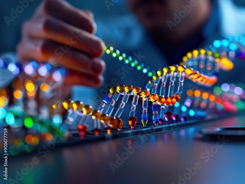 Close-up of a researcher assembling a colorful DNA model, showcasing the intricate details of genetic structures in a lab setting.
