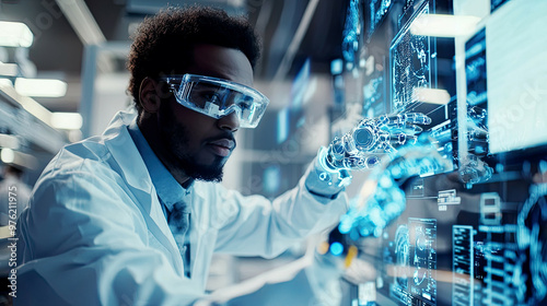 Close-up of a researcher using advanced tools and technologies, such as IoT devices, robotic automation, and AI systems, in a modern lab setting focused on digital disruption and innovation
