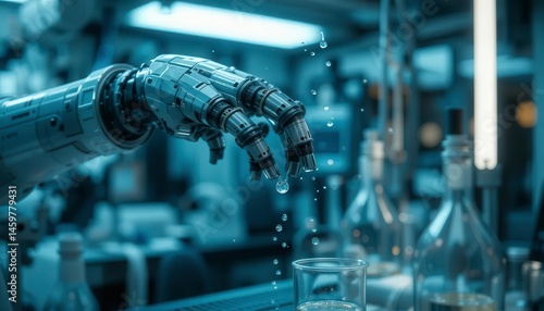 Close-up of a robotic arm conducting precise chemical experiments in a sterile lab, droplets suspended mid-air, cyberpunk aesthetic, Advanced Robotic Hand Pouring Liquid in Laboratory