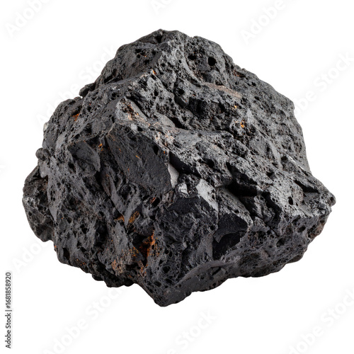 Close-up of a rough textured volcanic rock with porous surface and dark gray color on a white background for geology and nature themes