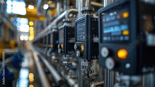 Close-up of a row of industrial control panels with digital displays and buttons, showing a blurred background of pipes and machinery.