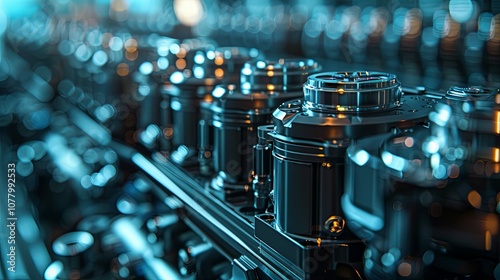Close-up of a Row of Shiny, Black Cylindrical Components in a Manufacturing Setting